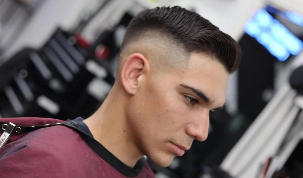 Der originale und wohl beste klassische Comb-Over-Fade zeichnet sich durch kurzes bis mittellanges Haar oben aus, das zu einem markanten Seitenscheitel gekämmt ist, mit einem sauberen Fade am Hinterkopf und an den Seiten. Es ist eine aktualisierte Version eines klassischen Ivy-League-Stils, der Tradition mit Moderne verbindet.